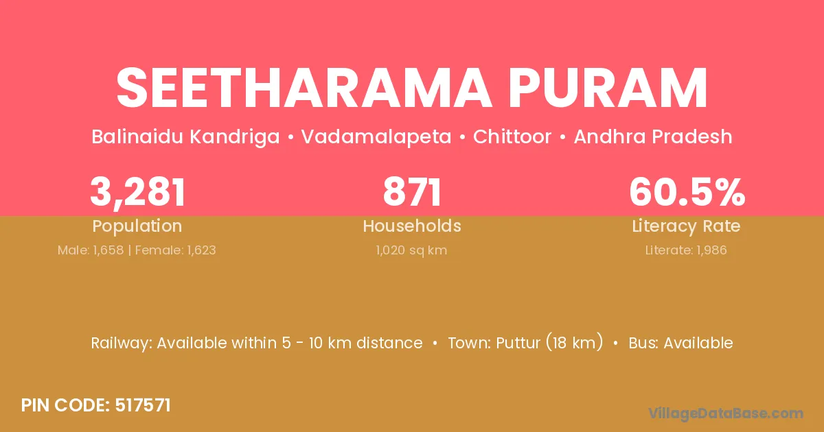Puttur (18 km) is the nearest town to Seetharama Puram village for major economic activities and is located approximately 18 km away.
