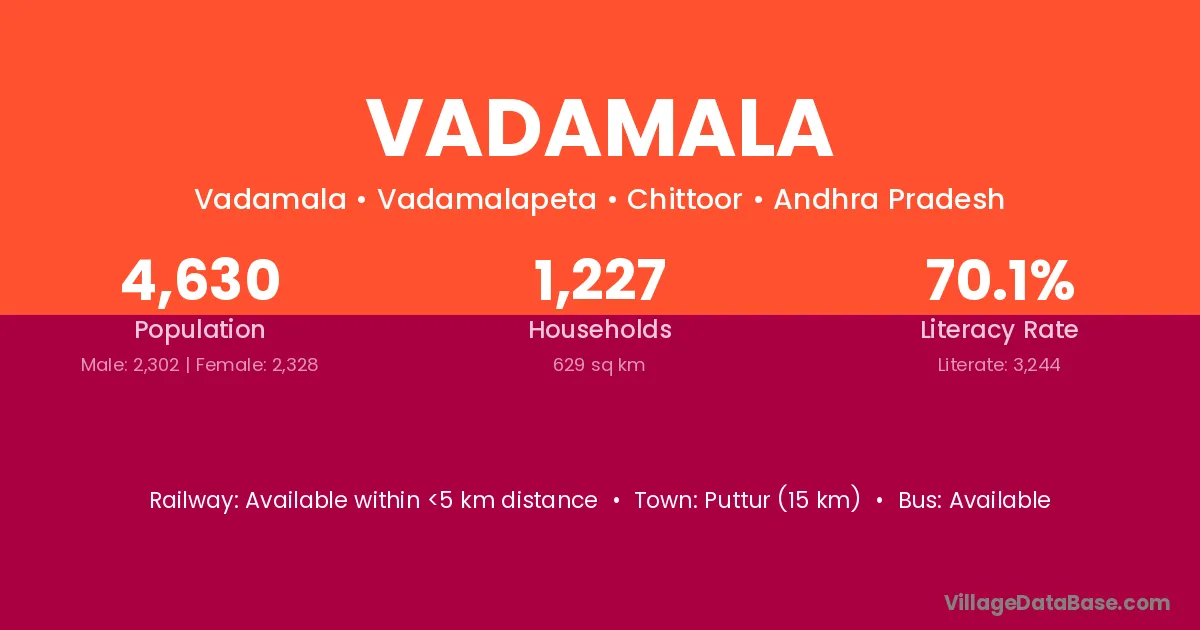 Puttur (15 km) is the nearest town to Vadamala village for major economic activities and is located approximately 15 km away.