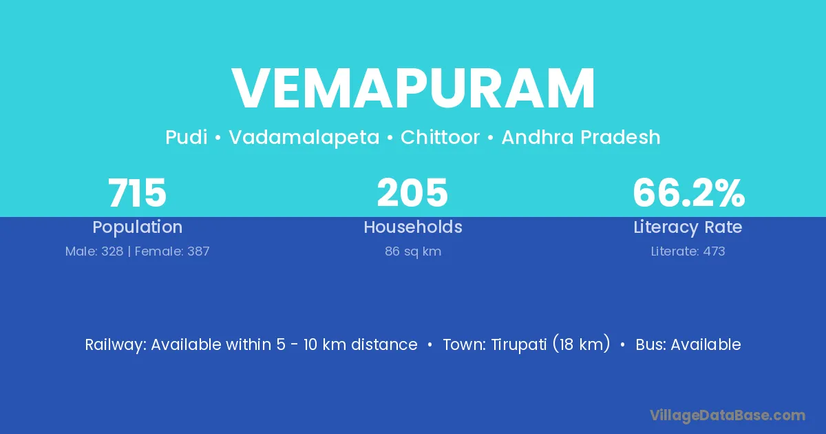 Tirupati (18 km) is the nearest town to Vemapuram village for major economic activities and is located approximately 18 km away.