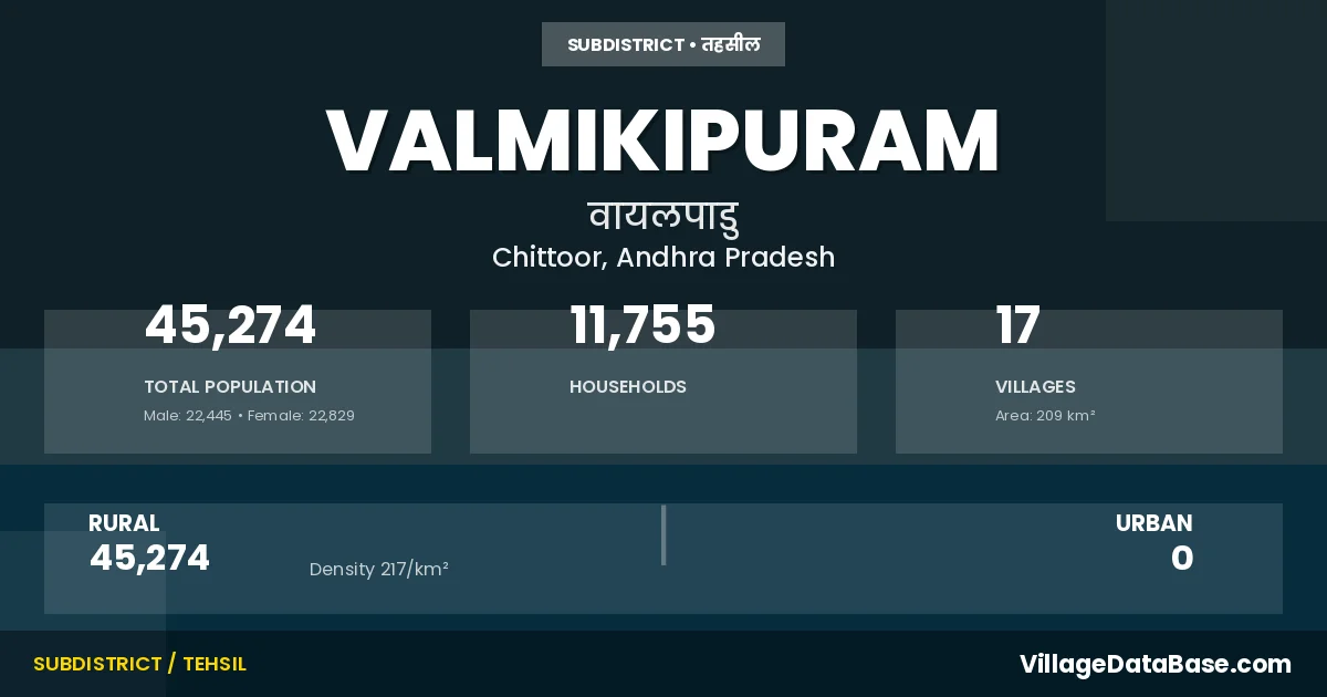 According to the 2011 census The total area of Valmikipuram Mandal is 209 km², with a population of 45274 people. The population density is 217 inhabitants per square kilometre, and there are approximately 11755 houses in the sub district.