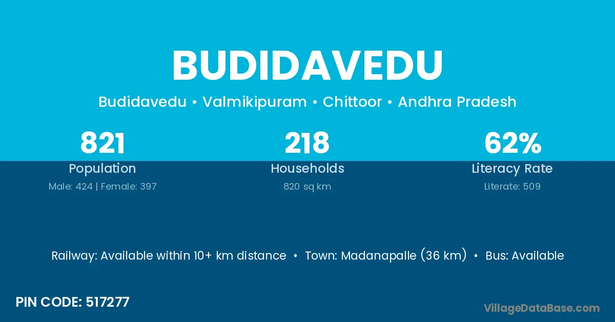 Madanapalle (36 km) is the nearest town to Budidavedu village for major economic activities and is located approximately 36 km away.