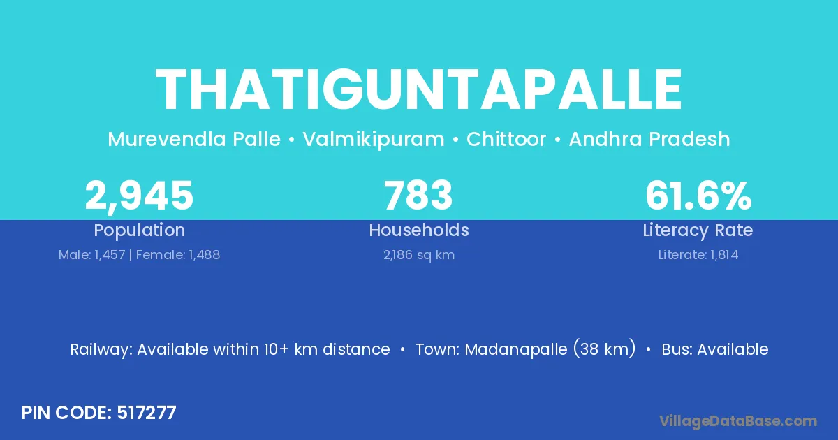 Madanapalle (38 km) is the nearest town to Thatiguntapalle village for major economic activities and is located approximately 38 km away.
