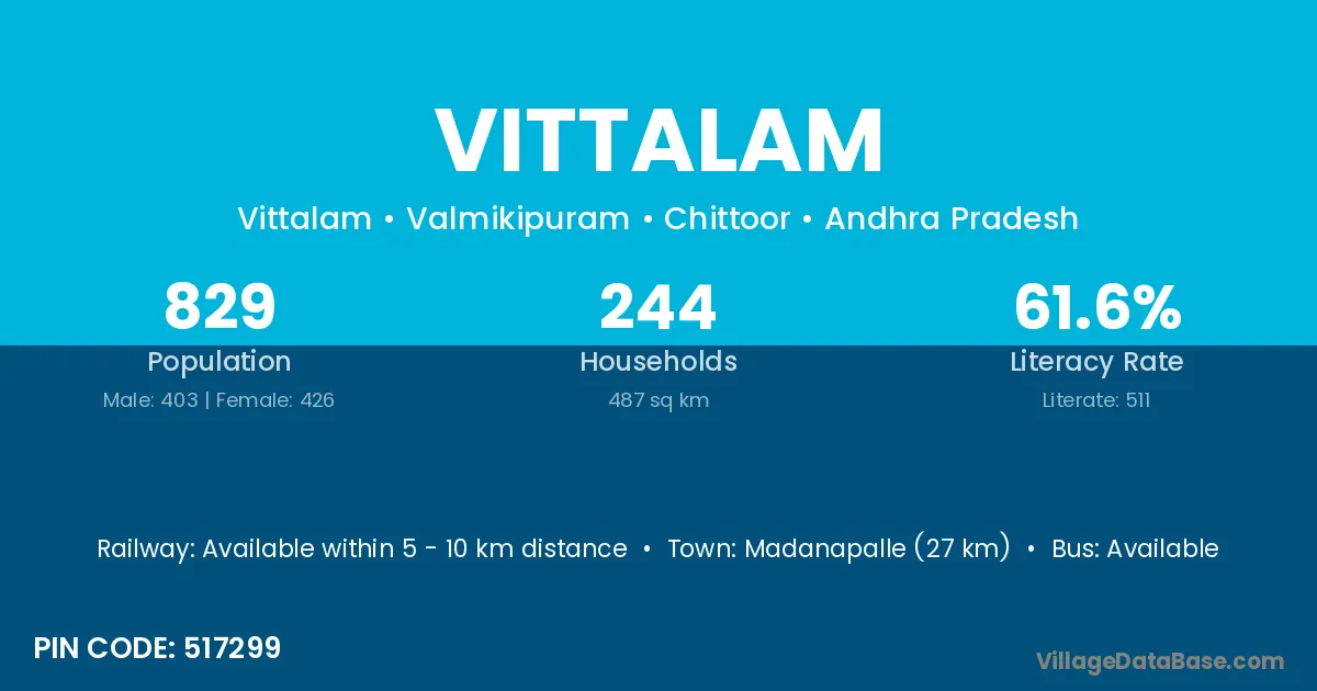 Madanapalle (27 km) is the nearest town to Vittalam village for major economic activities and is located approximately 27 km away.