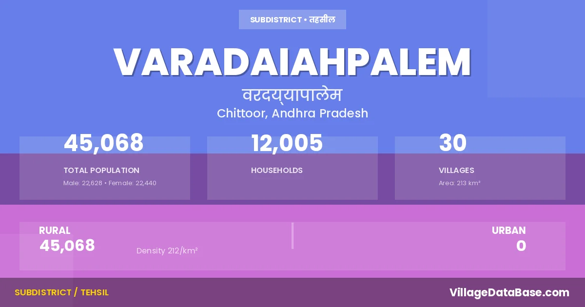 According to the 2011 census The total area of Varadaiahpalem Mandal is 213 km², with a population of 45068 people. The population density is 212 inhabitants per square kilometre, and there are approximately 12005 houses in the sub district.