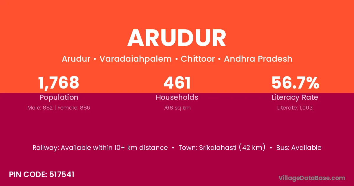 Srikalahasti (42 km) is the nearest town to Arudur village for major economic activities and is located approximately 42 km away.