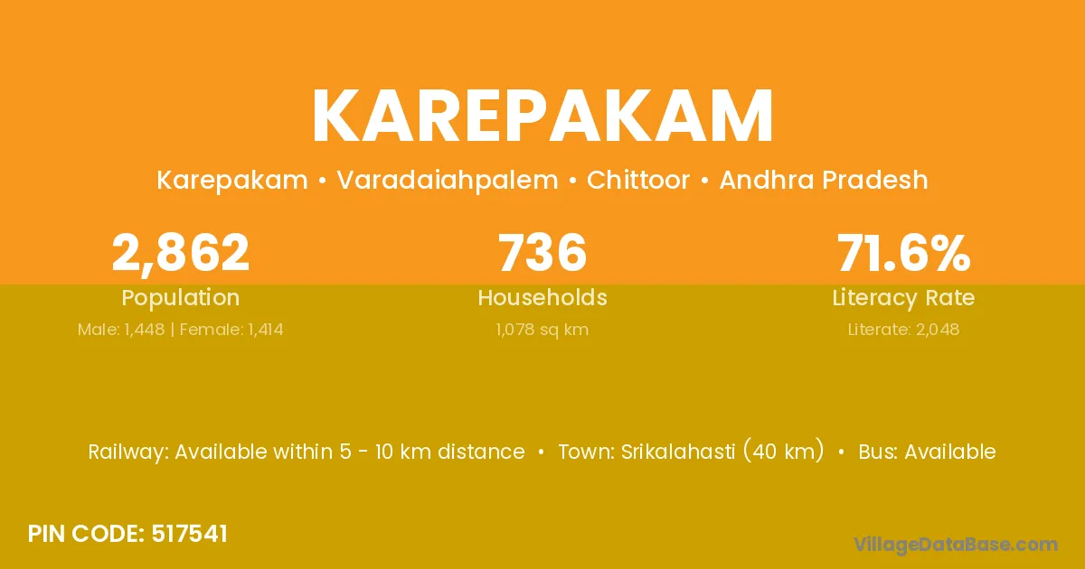 Srikalahasti (40 km) is the nearest town to Karepakam village for major economic activities and is located approximately 40 km away.