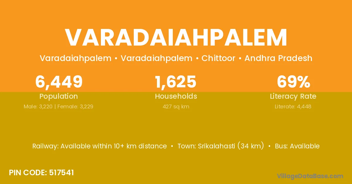 Srikalahasti (34 km) is the nearest town to Varadaiahpalem village for major economic activities and is located approximately 34 km away.