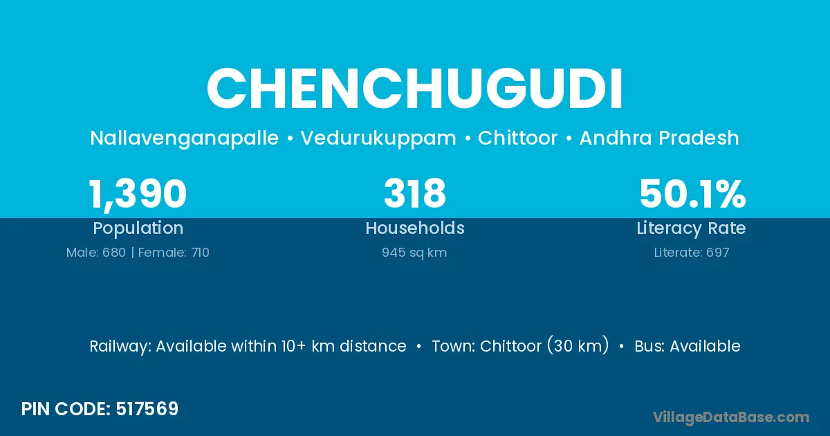 Chittoor (30 km) is the nearest town to Chenchugudi village for major economic activities and is located approximately 30 km away.