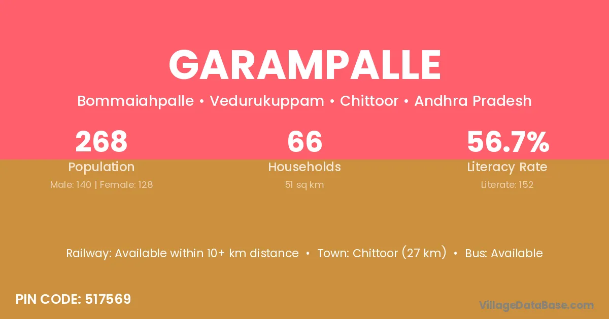 Chittoor (27 km) is the nearest town to Garampalle village for major economic activities and is located approximately 27 km away.