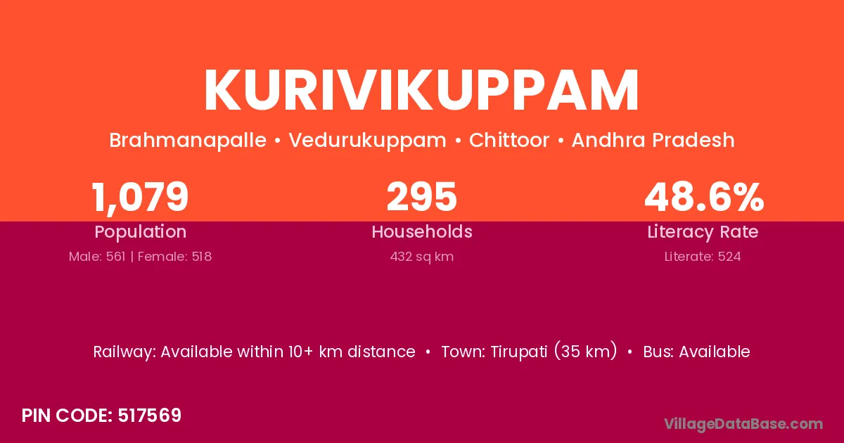 Kurivikuppam village has a total population of 1,079 people, of which 561 are males and 518 are females.