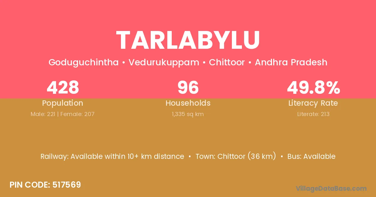 Chittoor (36 km) is the nearest town to Tarlabylu village for major economic activities and is located approximately 36 km away.