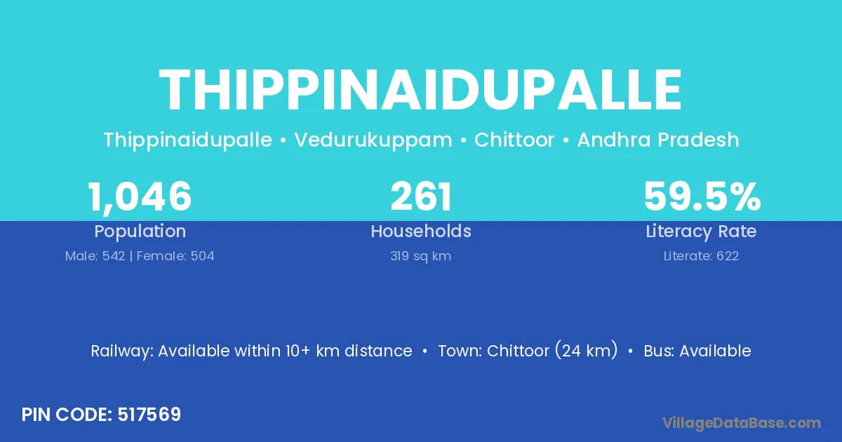 Chittoor (24 km) is the nearest town to Thippinaidupalle village for major economic activities and is located approximately 24 km away.