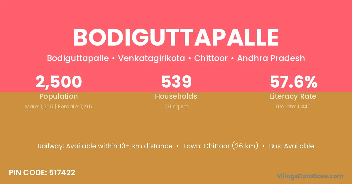 Chittoor (26 km) is the nearest town to Bodiguttapalle village for major economic activities and is located approximately 26 km away.