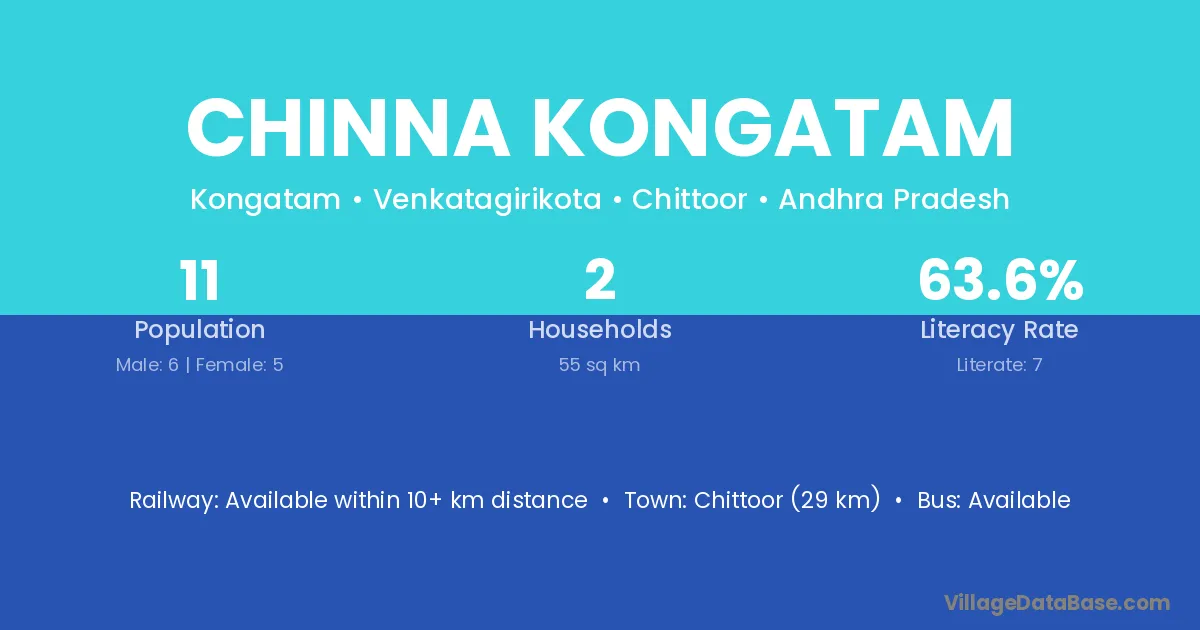 Chinna Kongatam village has a total population of 11 people, of which 6 are males and 5 are females.