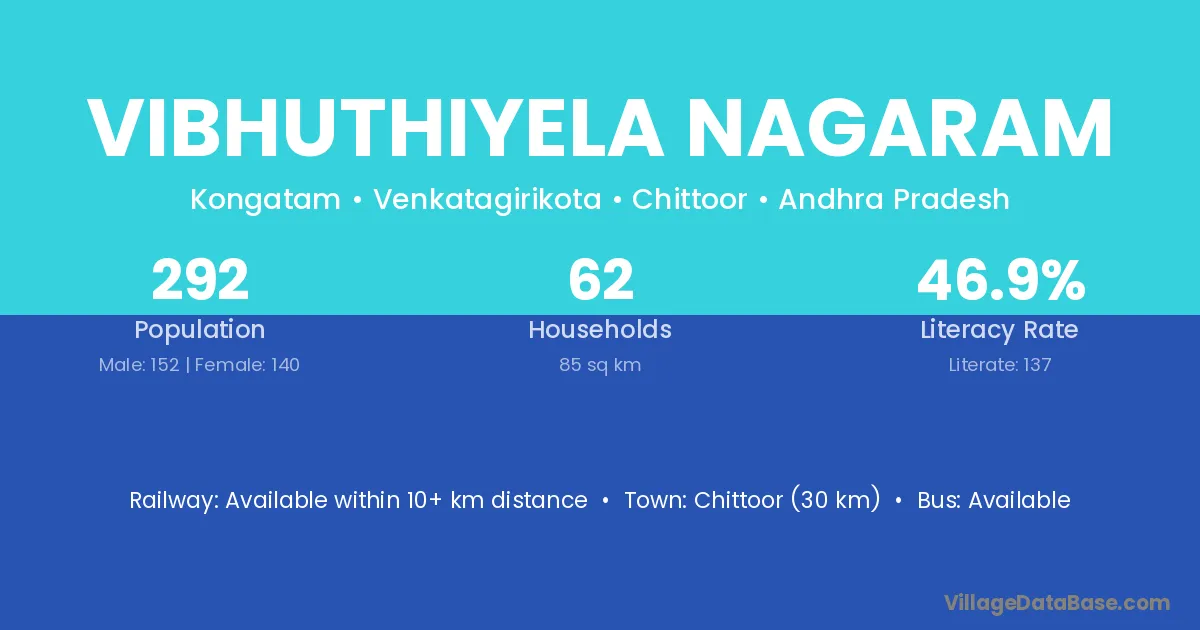 Chittoor (30 km) is the nearest town to Vibhuthiyela Nagaram village for major economic activities and is located approximately 30 km away.