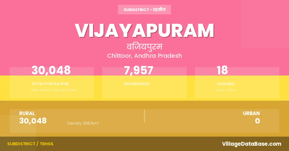 According to the 2011 census The total area of Vijayapuram Mandal is 101 km², with a population of 30048 people. The population density is 298 inhabitants per square kilometre, and there are approximately 7957 houses in the sub district.
