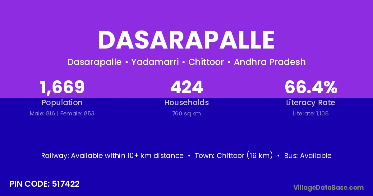 Chittoor (16 km) is the nearest town to Dasarapalle village for major economic activities and is located approximately 16 km away.