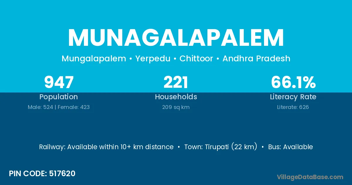 Tirupati (22 km) is the nearest town to Munagalapalem village for major economic activities and is located approximately 22 km away.