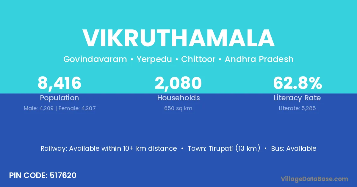 Tirupati (13 km) is the nearest town to Vikruthamala village for major economic activities and is located approximately 13 km away.