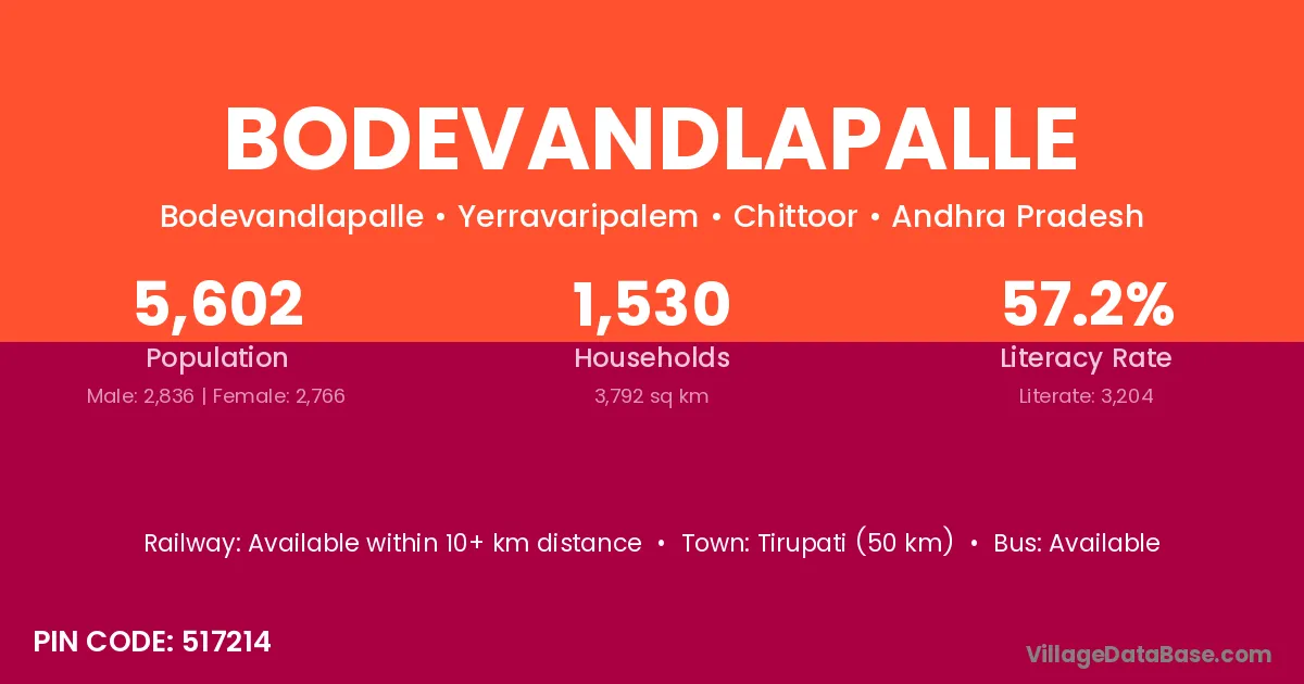 Tirupati (50 km) is the nearest town to Bodevandlapalle village for major economic activities and is located approximately 50 km away.