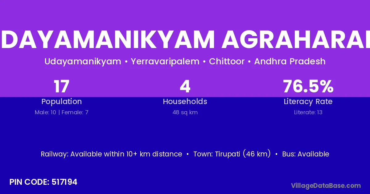 Udayamanikyam Agraharam village has a total population of 17 people, of which 10 are males and 7 are females.