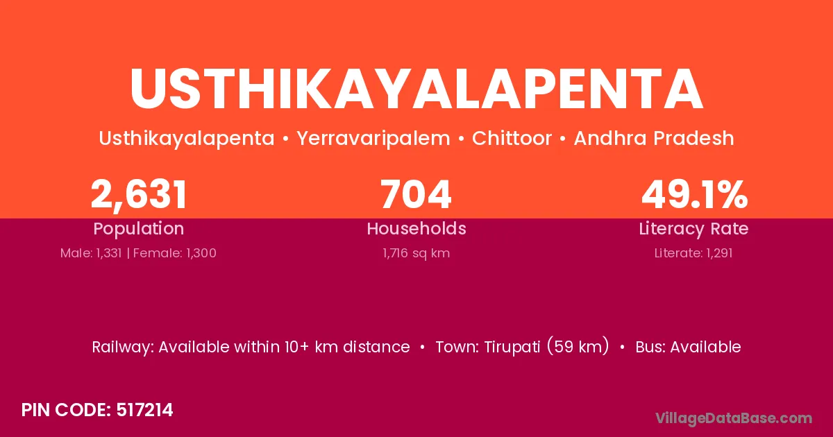 Tirupati (59 km) is the nearest town to Usthikayalapenta village for major economic activities and is located approximately 59 km away.
