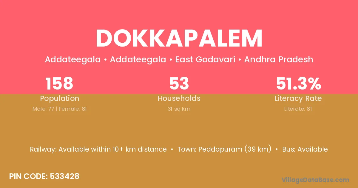 Dokkapalem village has a total population of 158 people, of which 77 are males and 81 are females.
