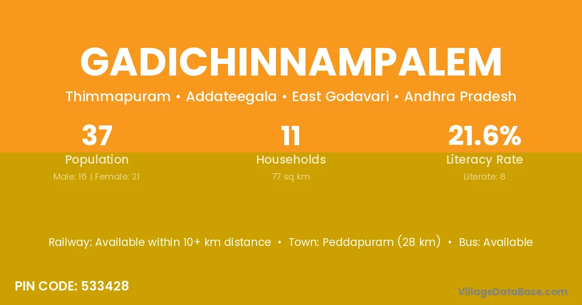 Gadichinnampalem village has a total population of 37 people, of which 16 are males and 21 are females.