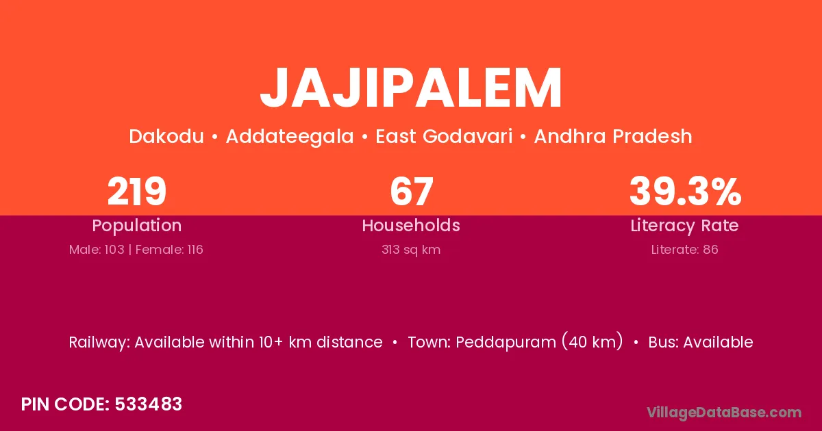 Jajipalem village has a total population of 219 people, of which 103 are males and 116 are females.