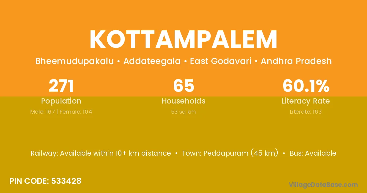 Peddapuram (45 km) is the nearest town to Kottampalem village for major economic activities and is located approximately 45 km away.