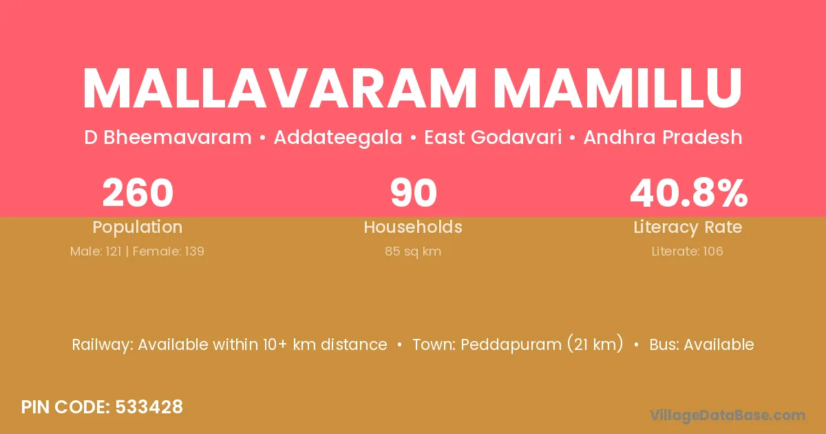 Mallavaram Mamillu village has a total population of 260 people, of which 121 are males and 139 are females.