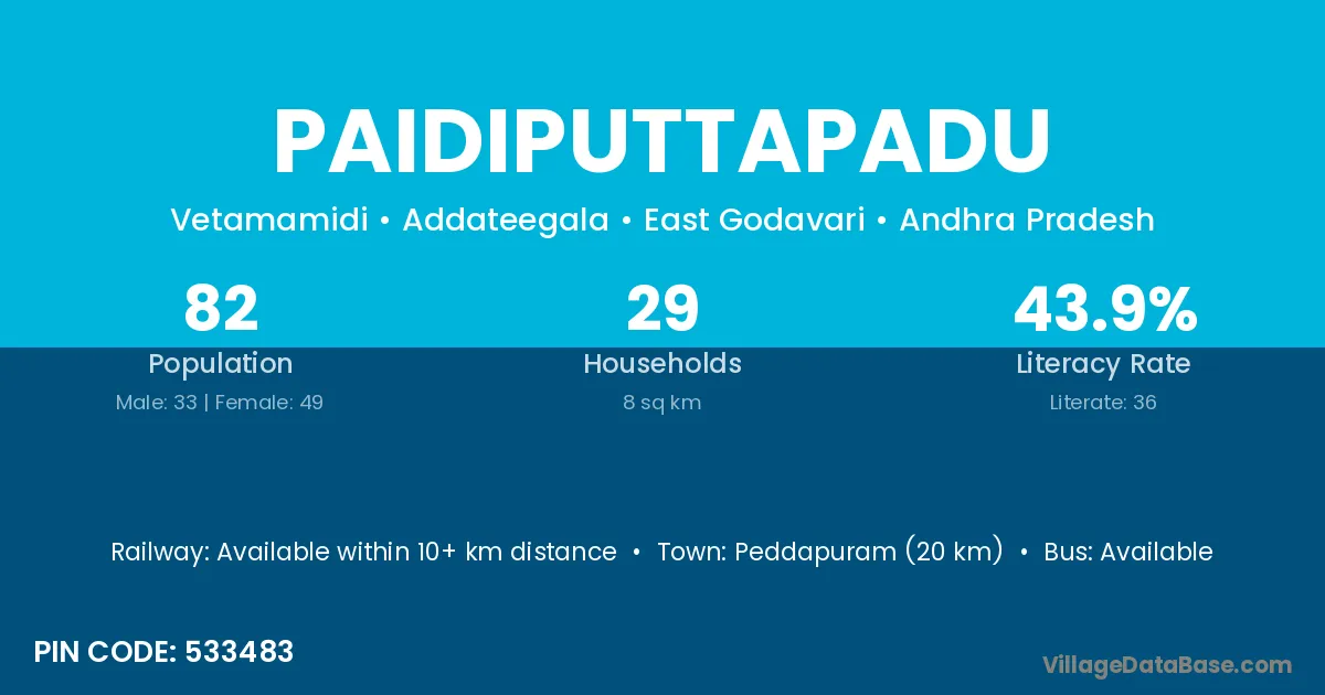 Peddapuram (20 km) is the nearest town to Paidiputtapadu village for major economic activities and is located approximately 20 km away.