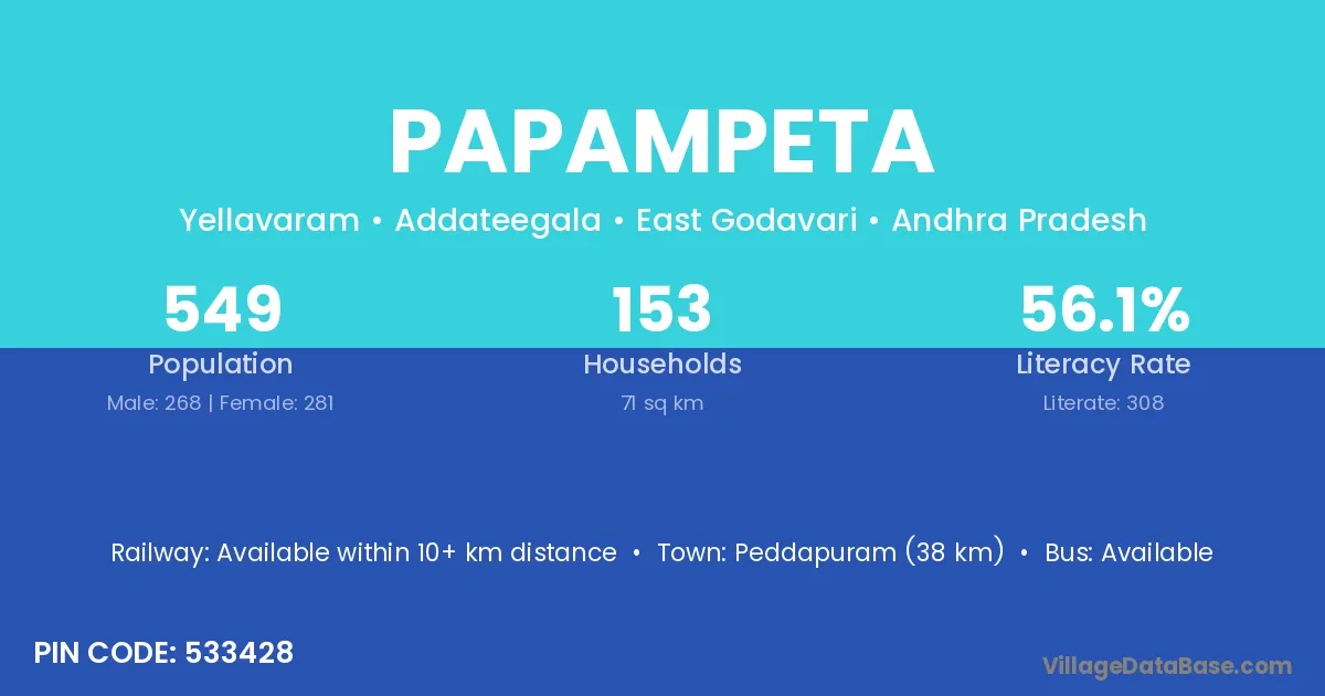 Peddapuram (38 km) is the nearest town to Papampeta village for major economic activities and is located approximately 38 km away.