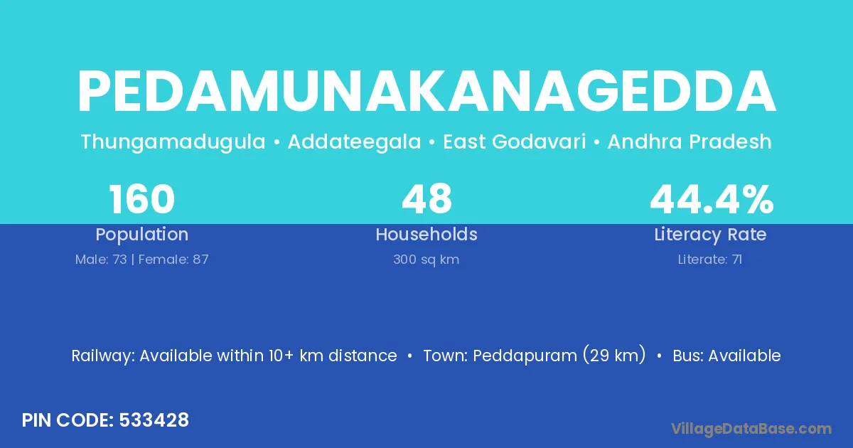 Pedamunakanagedda village has a total population of 160 people, of which 73 are males and 87 are females.