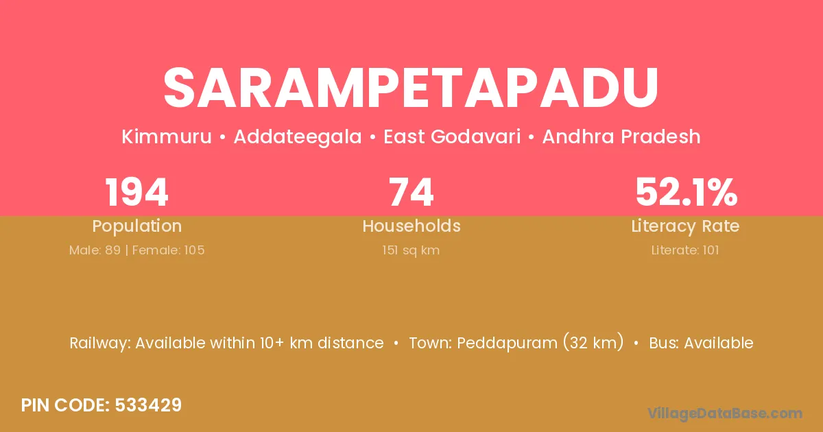 Peddapuram (32 km) is the nearest town to Sarampetapadu village for major economic activities and is located approximately 32 km away.