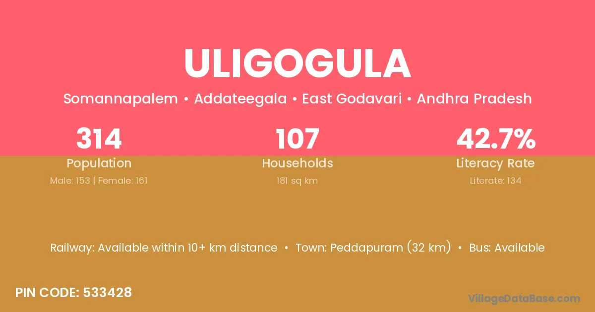 Peddapuram (32 km) is the nearest town to Uligogula village for major economic activities and is located approximately 32 km away.