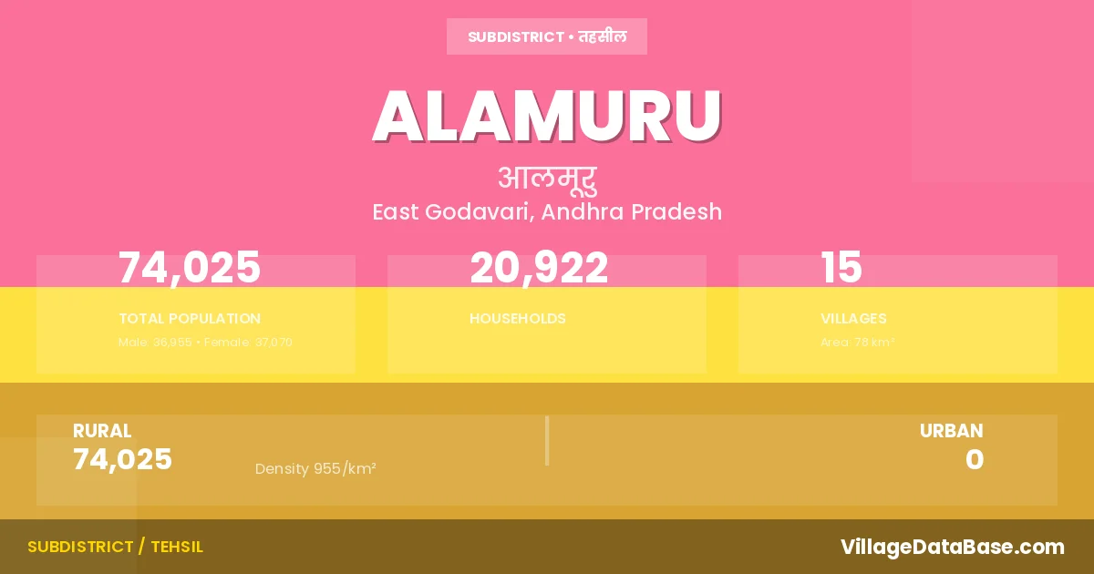 According to the 2011 census The total area of Alamuru Mandal is 78 km², with a population of 74025 people. The population density is 955 inhabitants per square kilometre, and there are approximately 20922 houses in the sub district.