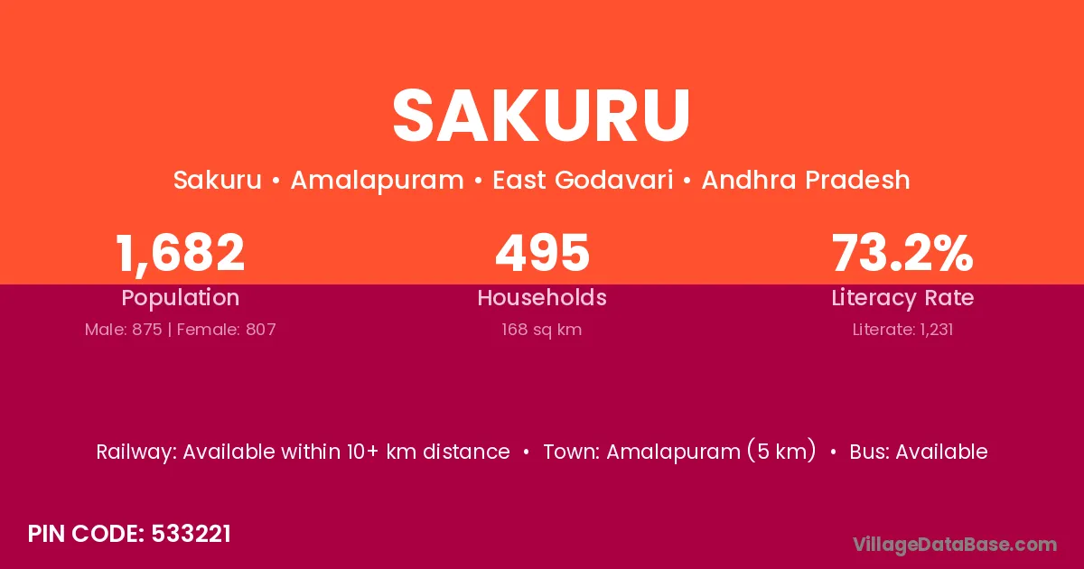 Amalapuram (5 km) is the nearest town to Sakuru village for major economic activities and is located approximately 5 km away.