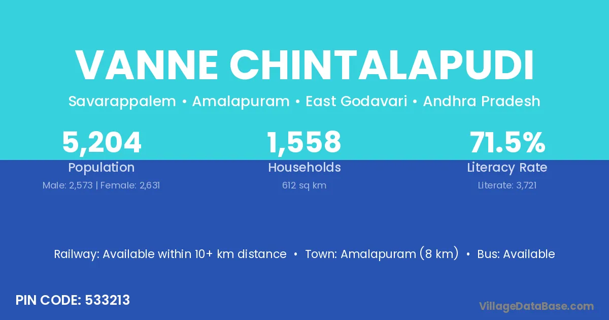 Amalapuram (8 km) is the nearest town to Vanne Chintalapudi village for major economic activities and is located approximately 8 km away.