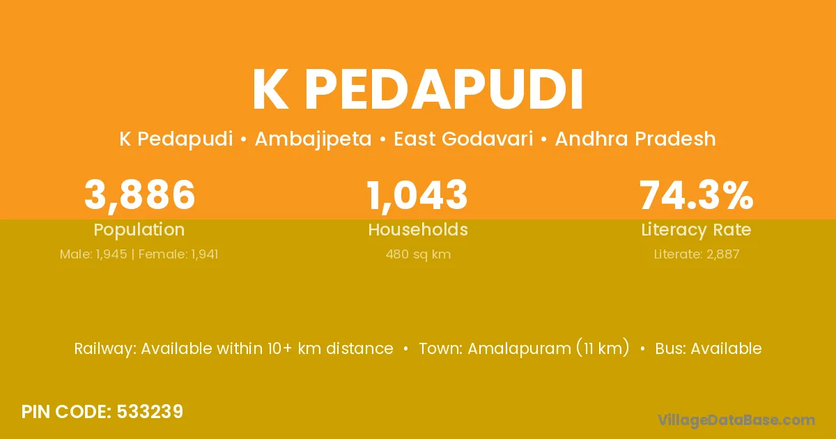 Amalapuram (11 km) is the nearest town to K Pedapudi village for major economic activities and is located approximately 11 km away.