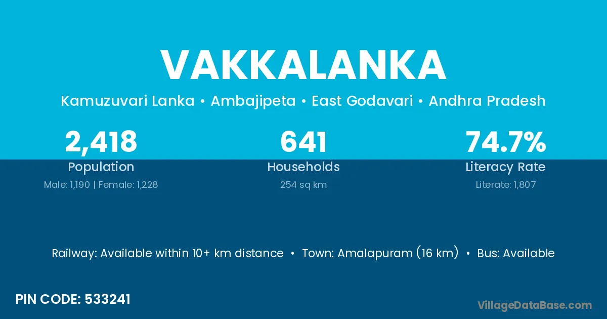 Amalapuram (16 km) is the nearest town to Vakkalanka village for major economic activities and is located approximately 16 km away.