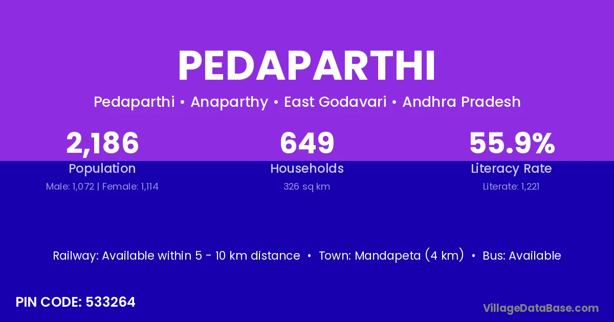 Mandapeta (4 km) is the nearest town to Pedaparthi village for major economic activities and is located approximately 4 km away.