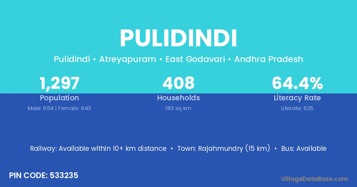 Rajahmundry (15 km) is the nearest town to Pulidindi village for major economic activities and is located approximately 15 km away.