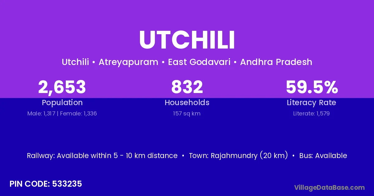 Rajahmundry (20 km) is the nearest town to Utchili village for major economic activities and is located approximately 20 km away.