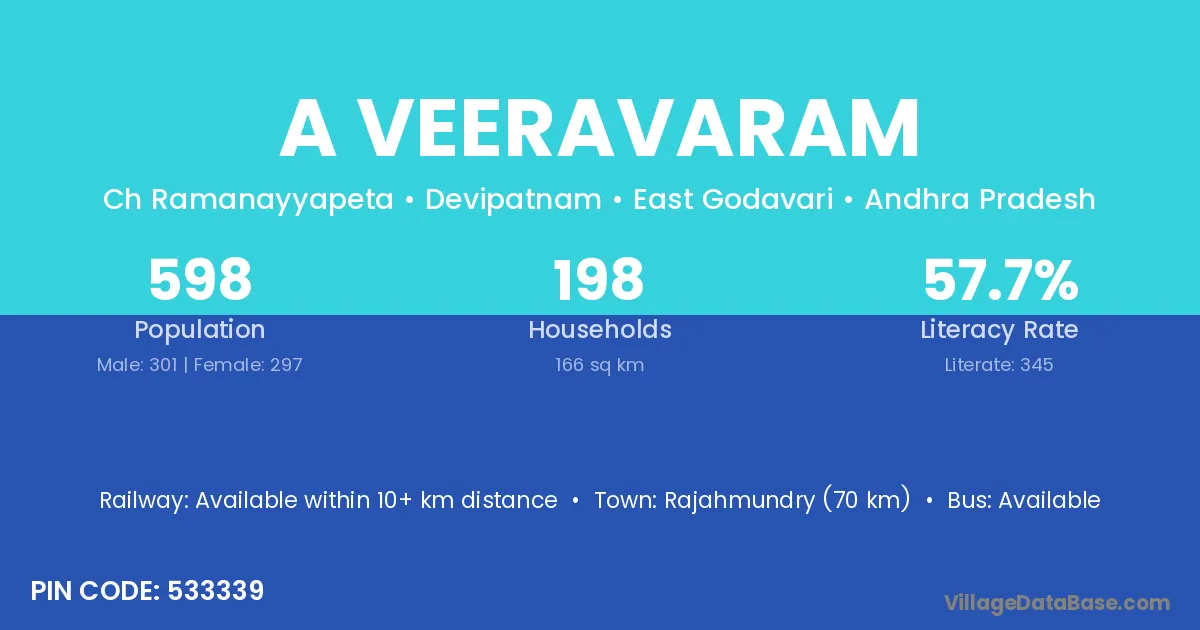 Rajahmundry (70 km) is the nearest town to A Veeravaram village for major economic activities and is located approximately 70 km away.