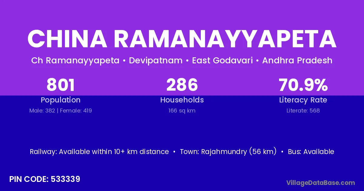 Rajahmundry (56 km) is the nearest town to China Ramanayyapeta village for major economic activities and is located approximately 56 km away.