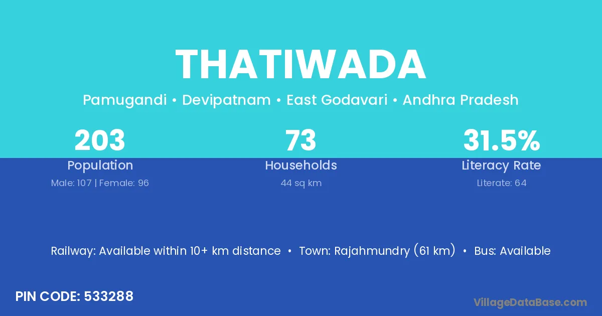 Rajahmundry (61 km) is the nearest town to Thatiwada village for major economic activities and is located approximately 61 km away.