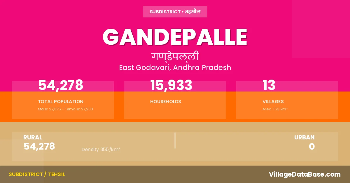According to the 2011 census The total area of Gandepalle Mandal is 153 km², with a population of 54278 people. The population density is 355 inhabitants per square kilometre, and there are approximately 15933 houses in the sub district.