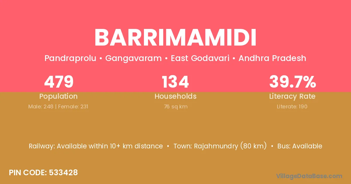 Barrimamidi village has a total population of 479 people, of which 248 are males and 231 are females.