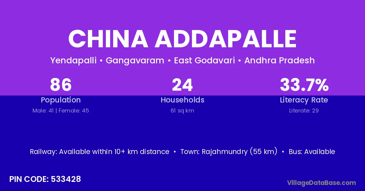 The literacy rate of China Addapalle village is 33.72%. Male literacy stands at 34.15% and female literacy at 33.33%.